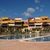 The complex features a large communal swimming pool and beautifully landscaped green areas.